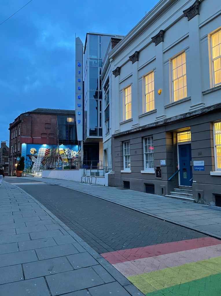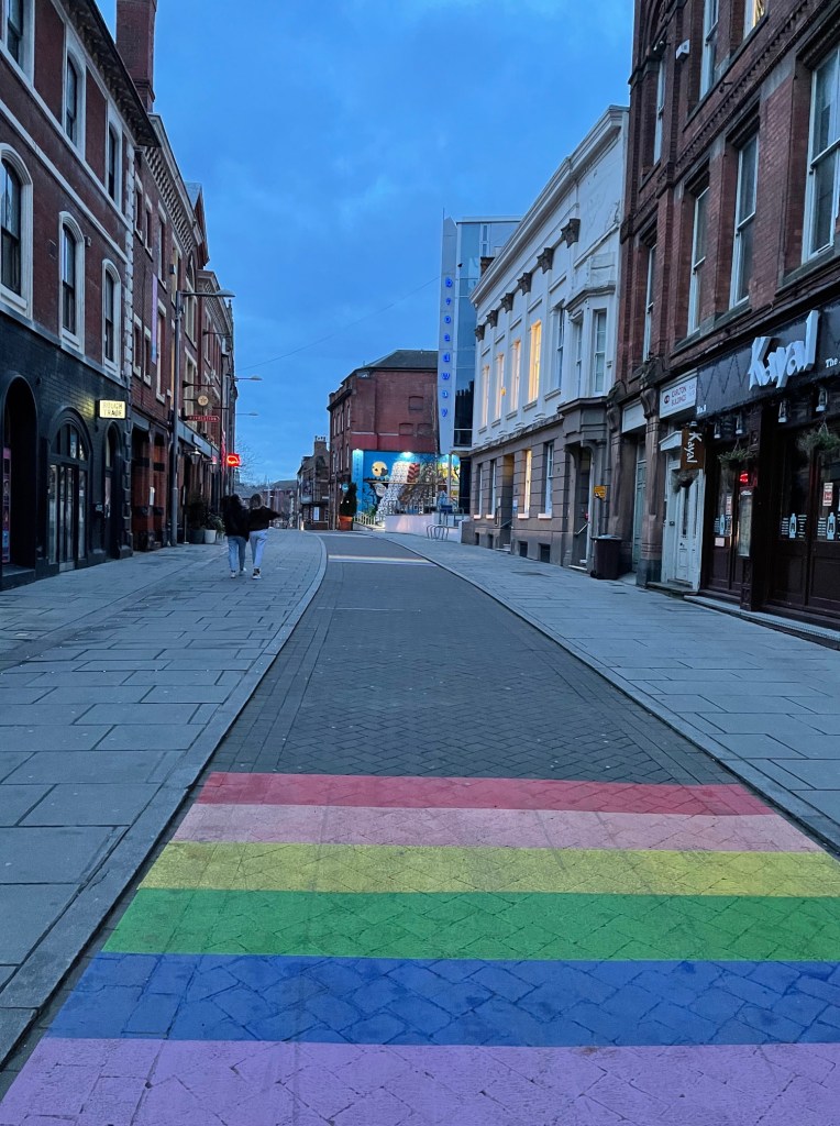 Carry on walking down Hockley across one of the painted rainbow crossings created for the 2019 Pride celebrations and turn down onto Broad Street, where predecessor to Nottingham Pride (Pink Lace) began life in 1997. As we walk down this now pedestrianised street, a number of gay and gay friendly venues sprung up with a welcoming vibe. Home to the GAi Project on the right, a little further down is the ever popular Broadway (Independent) Cinema that shows a range of LGBT films and hosts many community groups. On the left a group of short lived gay bars popped up in late 2018/19 including Bar 96. Carrying on down Broad Street, The Lord Roberts is nestled onto the corner of the road. Building on its reputation as a theatre bar, in the late 1990s it became more gay friendly and opened its Green Room to many LGBT groups. It has a predominantly gay clientele these days. Pop in for a refreshing drink and a happy hello.