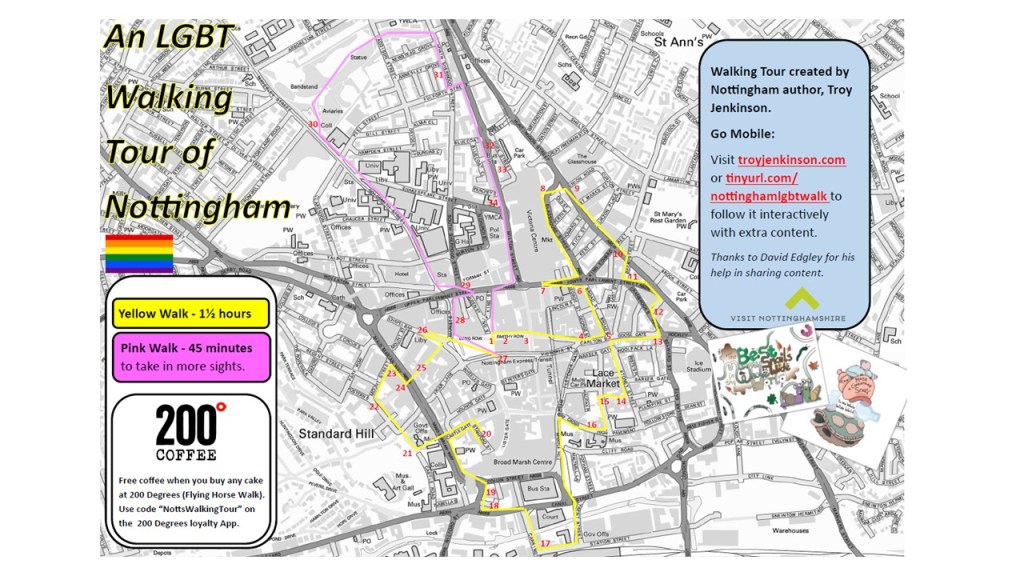 The shortened version of this walk finishes where we started, on the opposite side of Nottingham’s Council House. The Flying Horse was once a dingy, dark pub with salubrious clientele including queer folk in the 50s and 60s. Sometimes known as “The Pansy’s Parlour,” it now houses a delightful coffee shop run by local roasters, 200 Degrees. You can either finish your walk here with a refreshing drink and light snack or if you are feeling the energy (and the weather is good), you can venture on the second half of this walk taking you to the peace of The Arboretum.